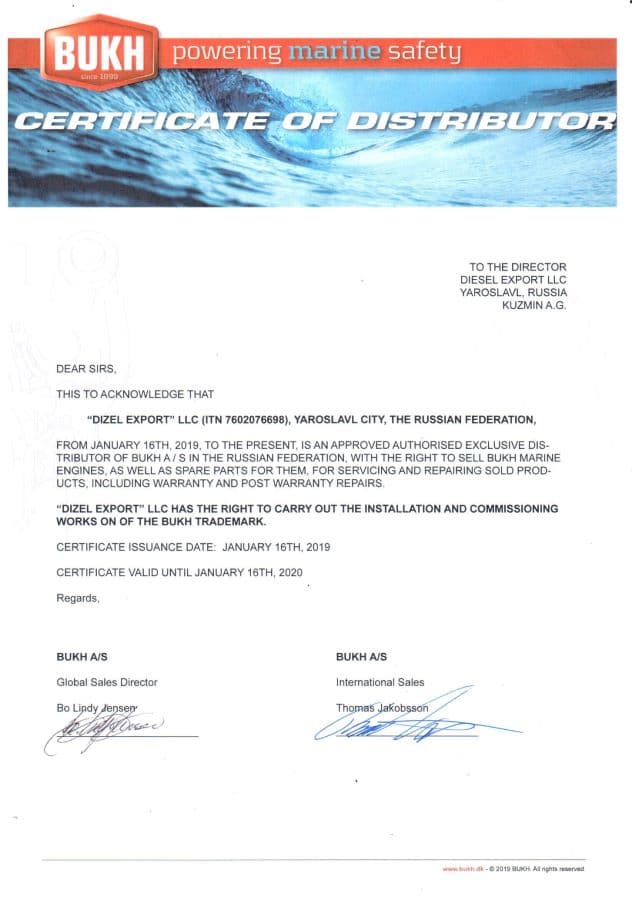 Сертификат дистрибьютера BUKH
