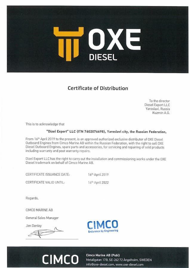 Сертификат официального дистрибьютера подвесных дизельных двигателей OXE от CIMCO Marine